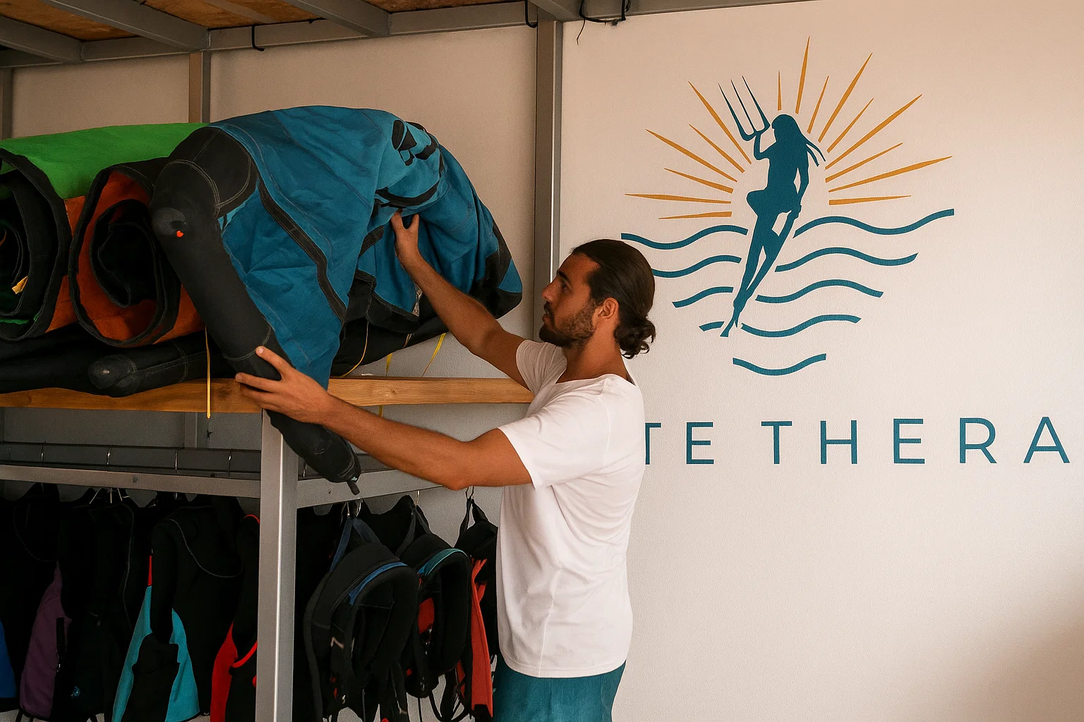 KiteThera, sadece sörf tutkunlarına değil, aynı zamanda sörf ekipmanlarını güvenli bir şekilde saklayabilecekleri modern ve kullanışlı bir depolama hizmeti sunar. Sörf dünyasında her şeyin zamanında ve düzenli olması önemlidir, bu nedenle KiteThera’nın depolama hizmeti, öğrencilerin ve eğitmenlerin ihtiyaç duydukları ekipmanlara kolay erişim sağlar ve sörf deneyimlerini daha keyifli hale getirir.